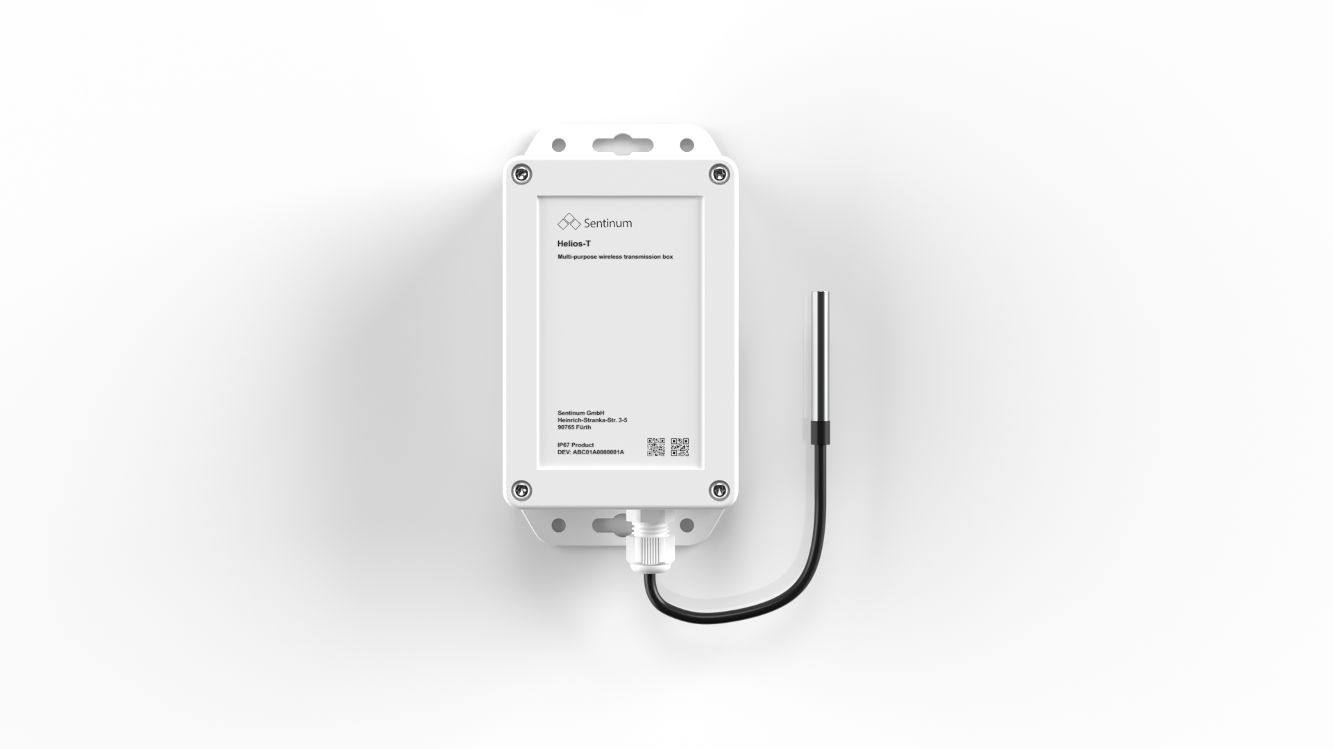 Sentinum Helios mioty® drahtlose multipurpose Anschlussbox ausgestattet mit einem Temperaturfühler 1-wire DS18B20, Kabeldurchführungen, ca. 1m Kabel, Kabelmaterial Silikon, Edelstahlhülse mit 30mm Länge und 6mm Durchmesser, IP65 (Fühler) weitere Versionen auf Anfrage oder als Zubehör, Messbereich Temperaturfühler -55°C bis +125°C, IP67 (Box), Gehäuse ABS/PC, Konfiguration über NFC, wechselbare Batterien (4 AA Zellen). Lieferumfang: Helios Smart Box, Temperaturfühler mit Kabel, Batterien.Eigenschaften Temperatursensor